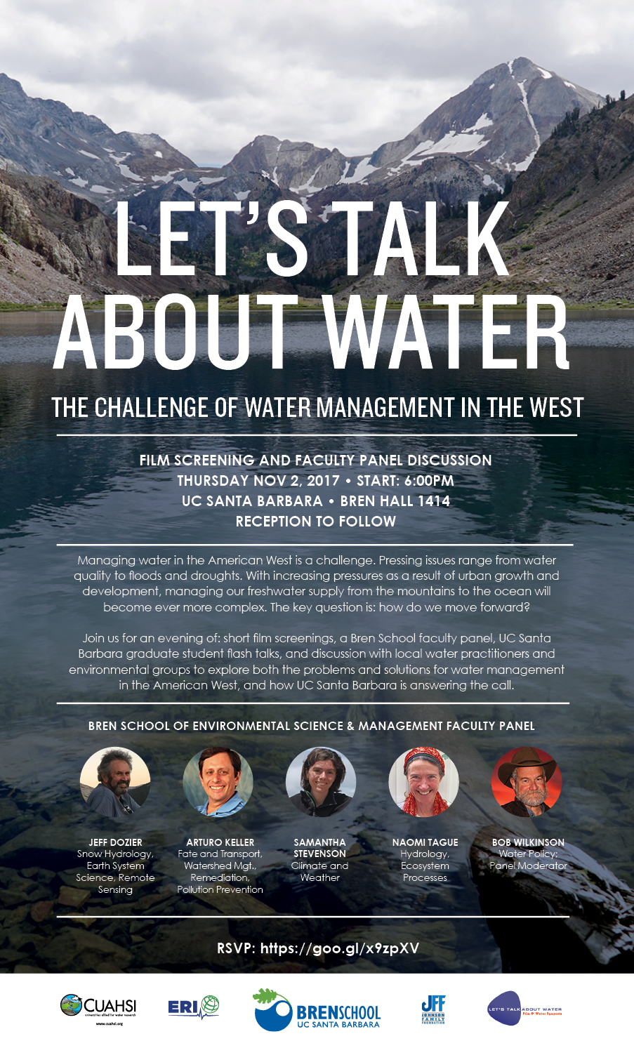 Let’s Talk About Water – The Challenge of Water Management in the West. Come for an evening of short film screenings, a Bren School faculty panel (Naomi Tague, Jeff Dozier, Arturo Keller, Samantha Stevenson and Bob Wilkinson), UC Santa Barbara graduate student flash talks, and discussion with local water practitioners and environmental groups to explore both the problems and solutions for water management in the American West, and how UC Santa Barbara is answering the call.