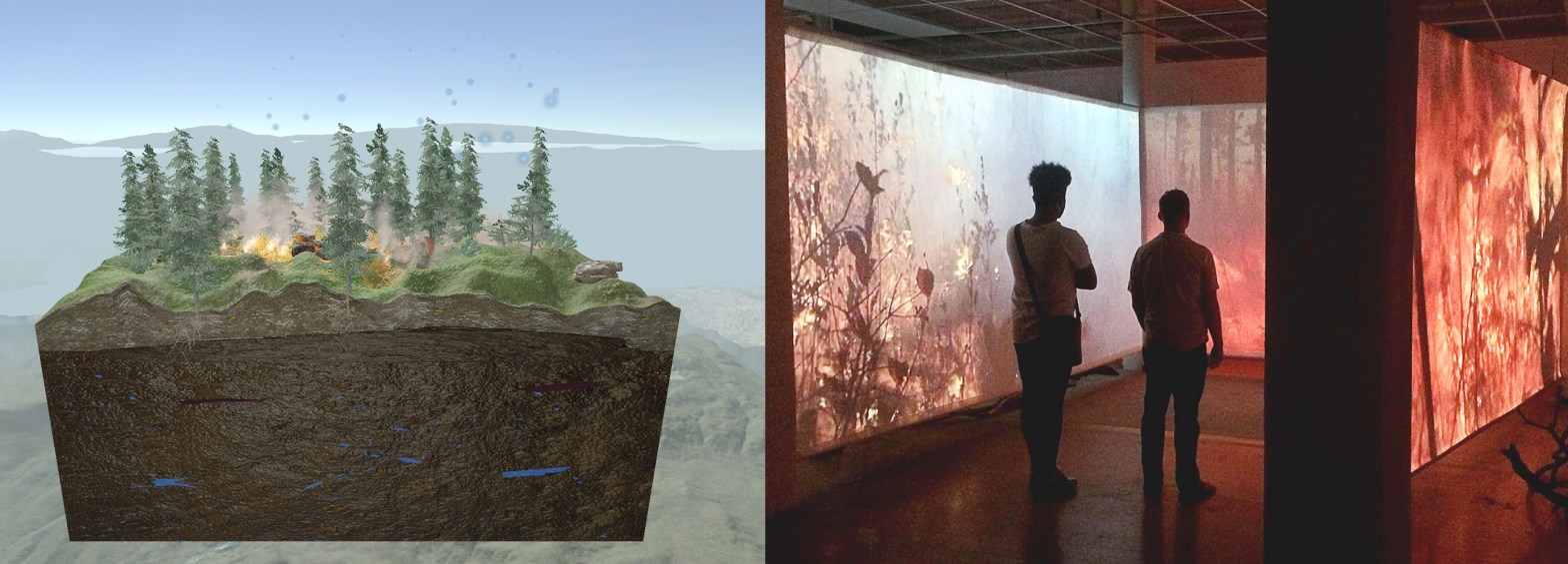 Opening tonight – “Burn Cycle: Living with Fire“. In this interactive and immersive media experience, you can see animated visual representations of RHESSys output for a watershed under warming and fire events. You can also experience what it is like to ‘Walk Into Wildfire‘ through a video projected environment on life size panels.