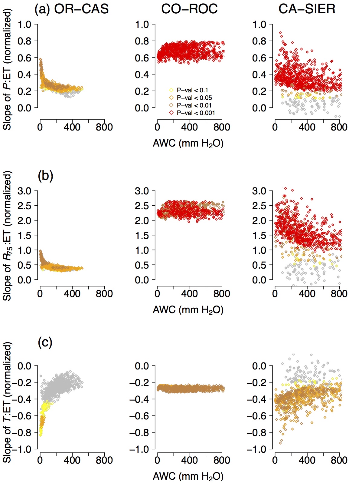 (b) R75, and (c) TAMJ. The slope of the ET–climate predictor